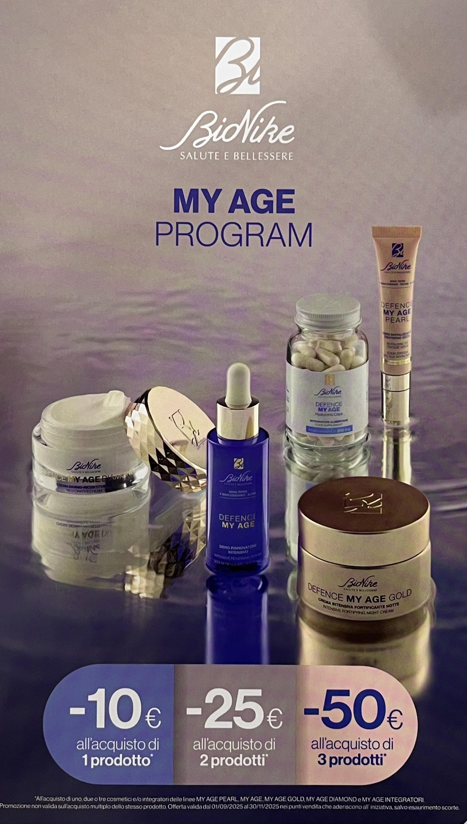 *All'acquisto di uno, due o tre cosmetici e/o integratori delle linee MY AGE PEARL, MY AGE,MY GOLD, MY AGE DIAMOND e MY AGE INTEGRATORI
